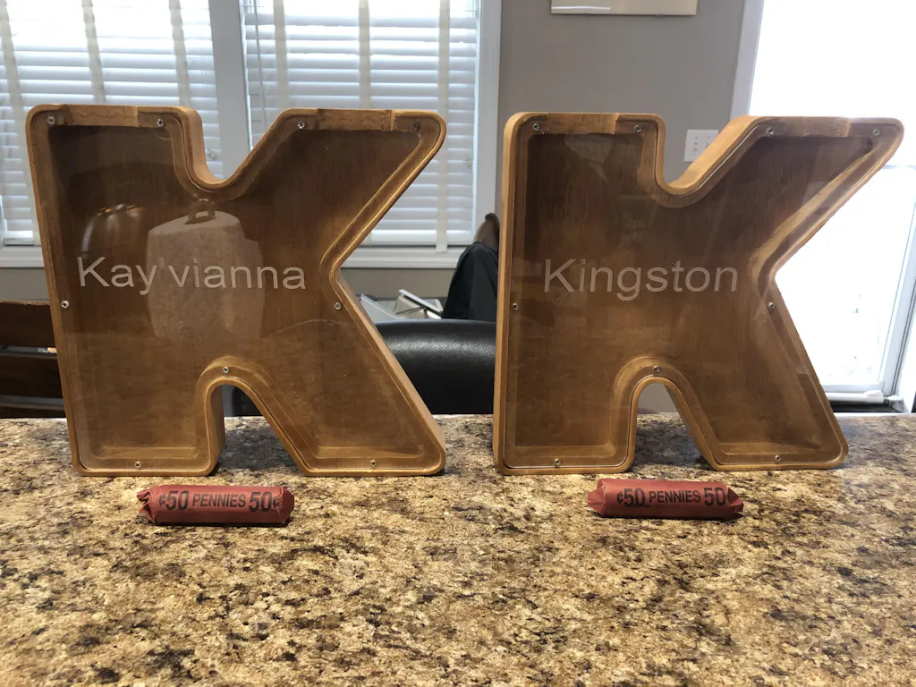 - The text (name) of your choice will be engraved onto your Letter Bank!